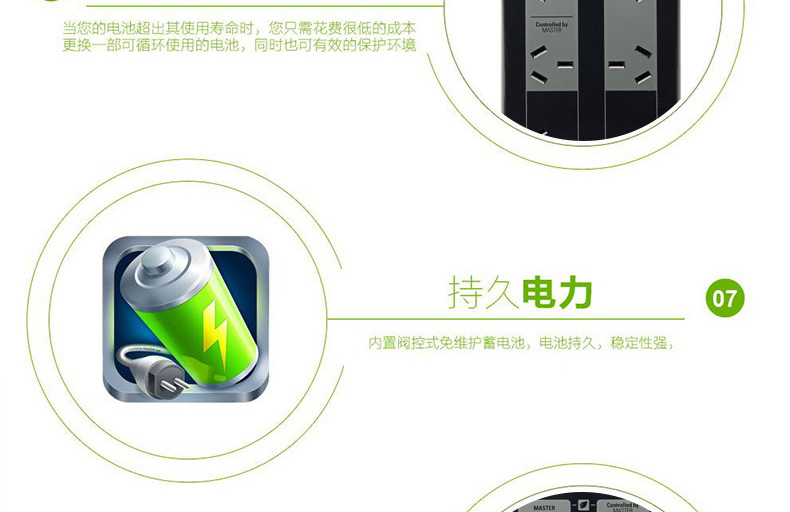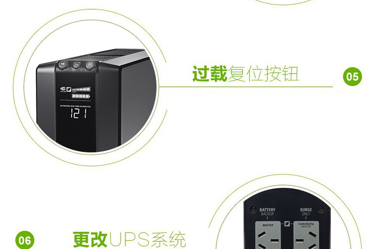 电池保护和电涌插座:为需要UPS备用电池的连接设备储备电源容量和运行时间,同时为太重要的设备仅提供浪涌保护。