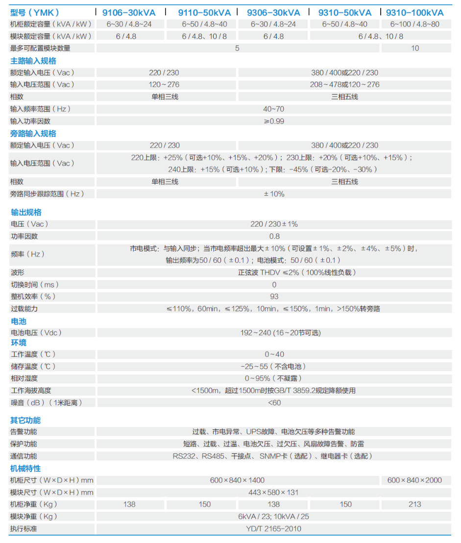 · 单模块容量6kVA/10kVA,所有模块高度均为3U。1.4米高的机柜最多可以安装5个模块2米高的机柜最多可以安装10个模块。6~100kVA系统由1~10个模块并联组成。模块与机柜间采用热插拔技术 ;