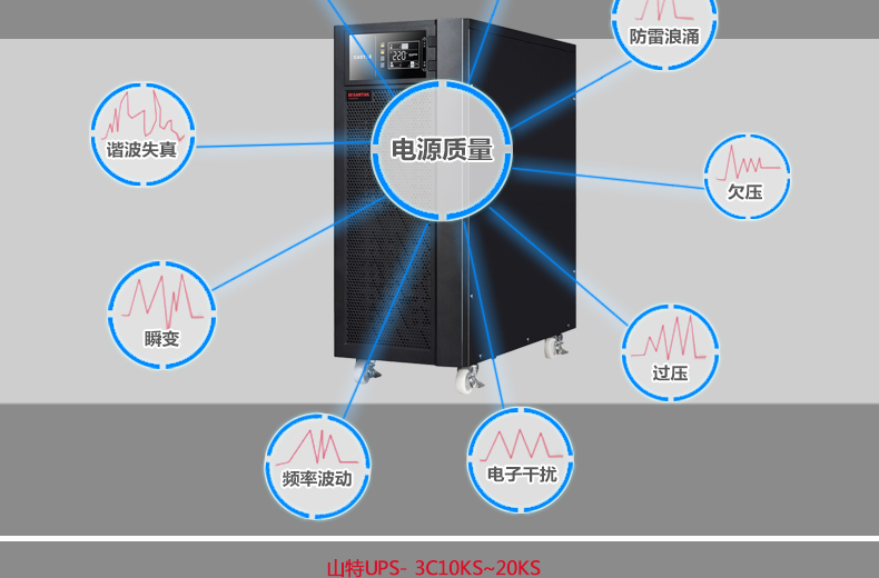 山特3C20KS系列UPS---传承上一代产品的优良品质,采用双转换纯在线式架构,外形美观,产品性能和产品可靠性大大提升。 对电网出现的断电、市电电压过高或过低、电压瞬间跌落或减幅震荡、 高压脉冲、电压波动、浪涌电压、谐波失真、杂波干扰、频率波动等状 况提供理想的解决方案,为用户负载提供安全可靠的电源保障。山特3C20KS是一款具有强大适应性、配置灵活的产品,采用先进的DSP数字控制技术,提供了非常丰富的可扩展功能, 用户可以根据需要灵活配置。