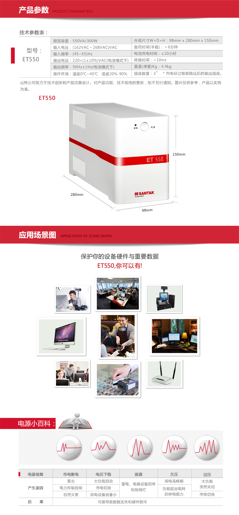山特550 UPS是针对中国电力环境设计的自动稳压型智能UPS,内置先进的MCU控制单元,有效的解决5 种电力问题:市电断电、电压下陷、浪涌、欠压、过压。功能强大,美观时尚,是电脑、POS机、收银台、ATM、路由器、闸机等设备的最佳保护。