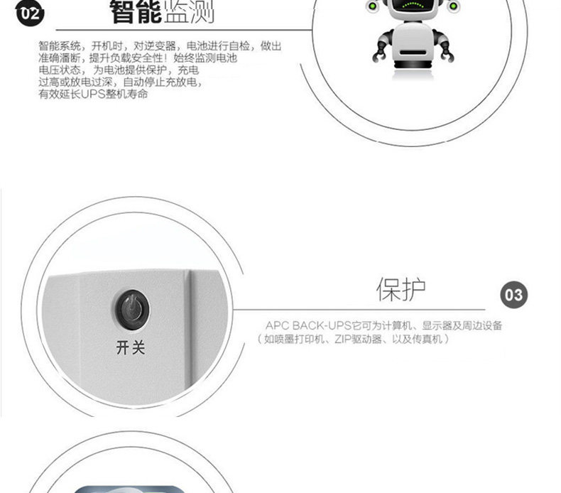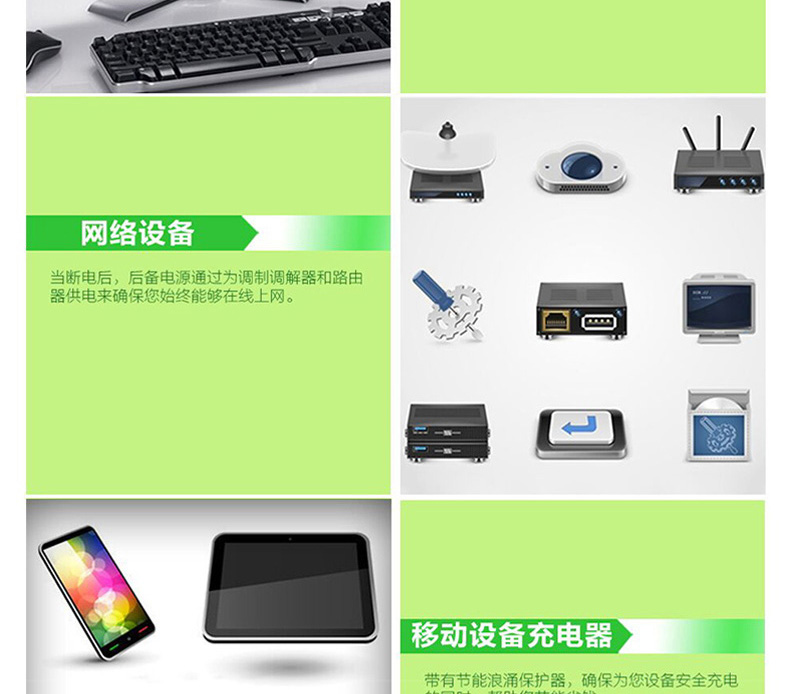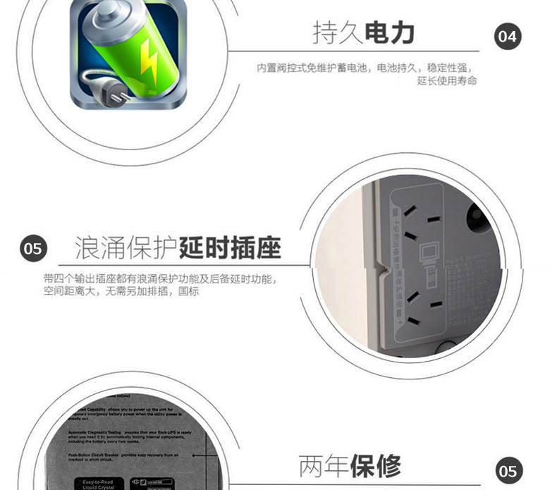 电池保护和电涌插座:为需要UPS备用电池的连接设备储备电源容量和运行时间,同时为太重要的设备仅提供浪涌保护。
