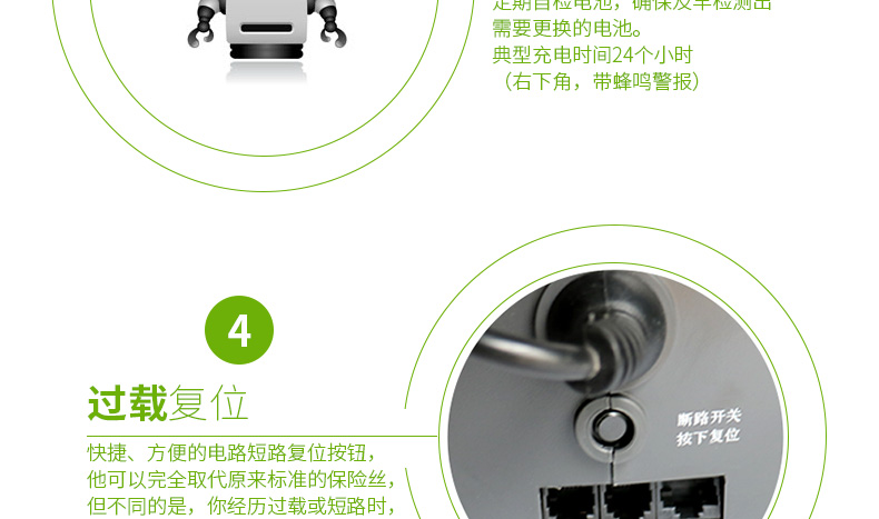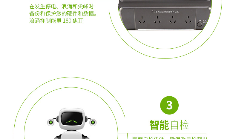 | 有声报警 | 市电停电时报警:低电量电池报警 | 浪涌能量额定值 | 180焦耳 |