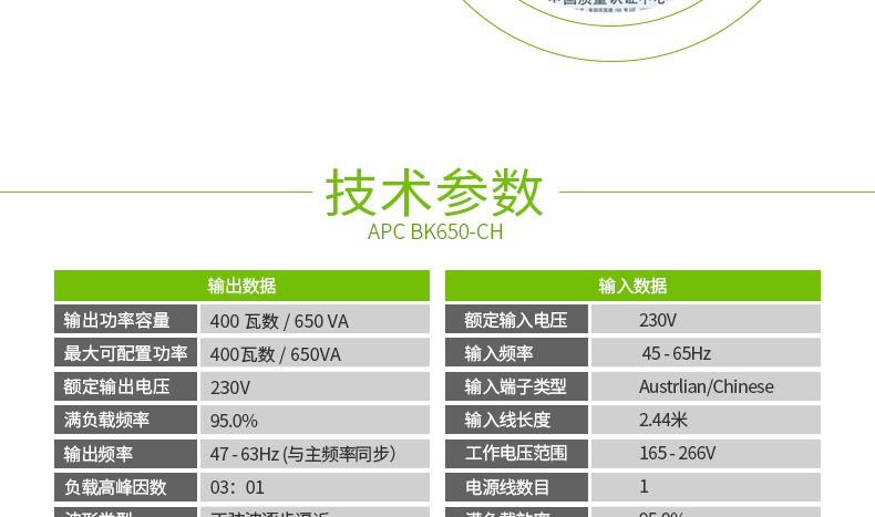 施耐德APC BK650-CH 不间断UPS电源/400W/650VA 后备式