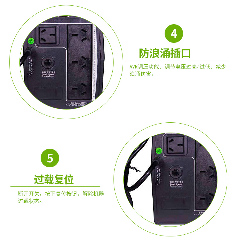 纯电涌插座:保护二级电子设备免受由于电涌和尖峰造成的损坏,而不会降低用于在停电时为主要电子设备供电的电池功率。