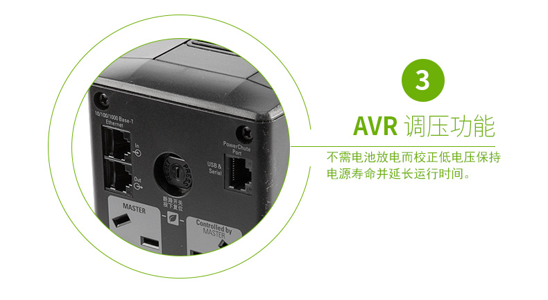 可自定义的电压灵敏度:根据您的电能质量(高、中或低灵敏度)在预先设定的电压转换点之间进行切换,从而能够最大限度地提高电池使用寿命以及保护敏感的电子设备。