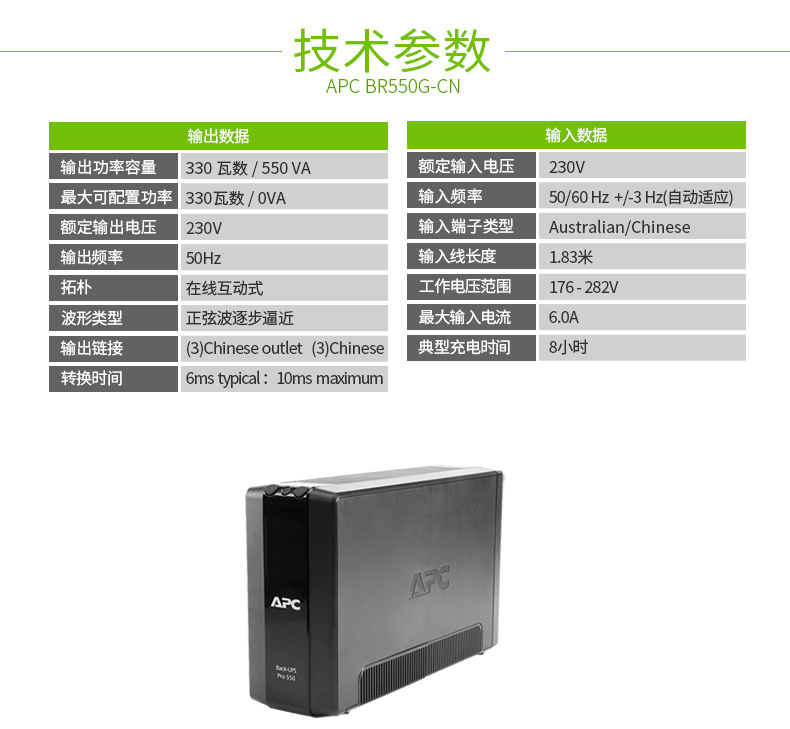施耐德APC BR550G-CN UPS不间断电源 330W 550VA 后备式