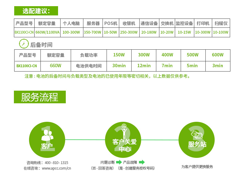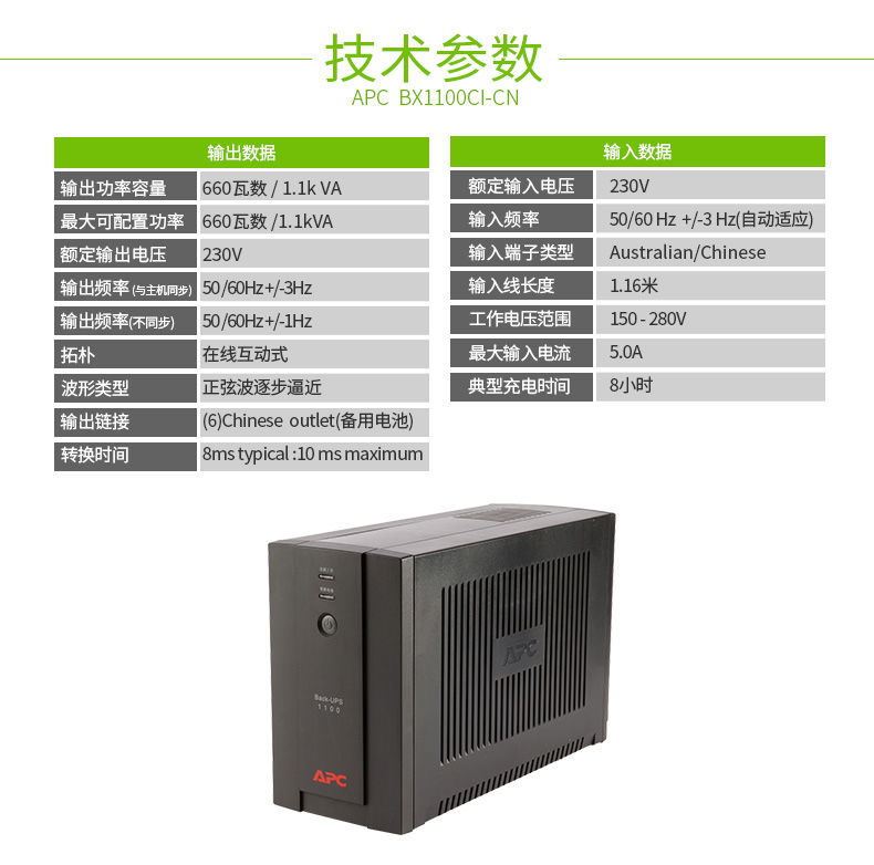 | 更换电池 | APCRBC113 | 预期电池寿命(年) | 3 - 5 |