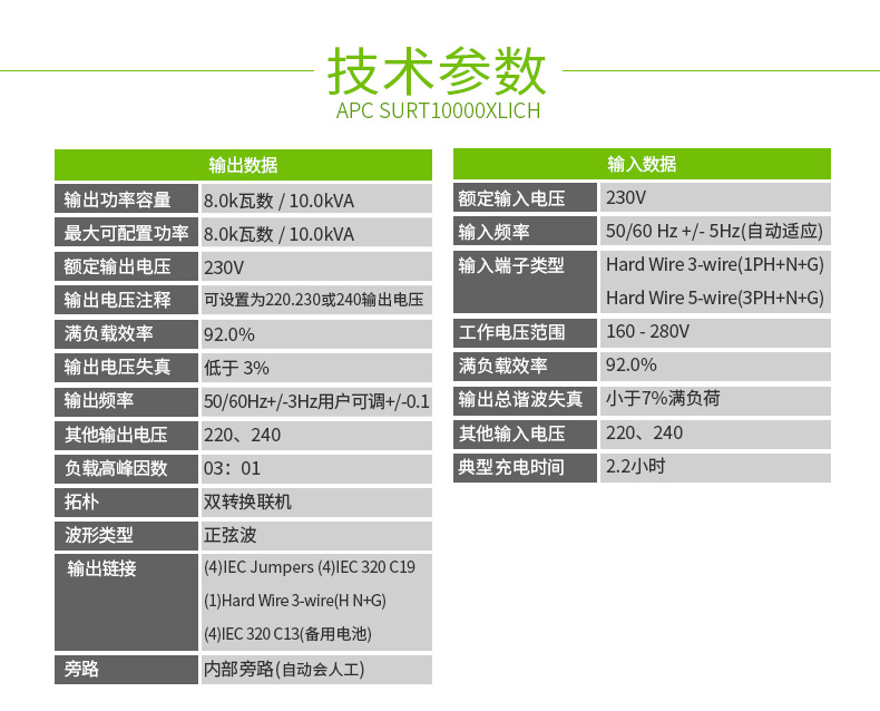 | 输出连接 | IEC 320 C13 (备用电池)IEC Jumpers (备用电池)IEC 320 C19 (备用电池)Hard Wire 3-wire (H N + G) (备用电池)Hard Wire 3-wire (H N + G) (备用电池) |