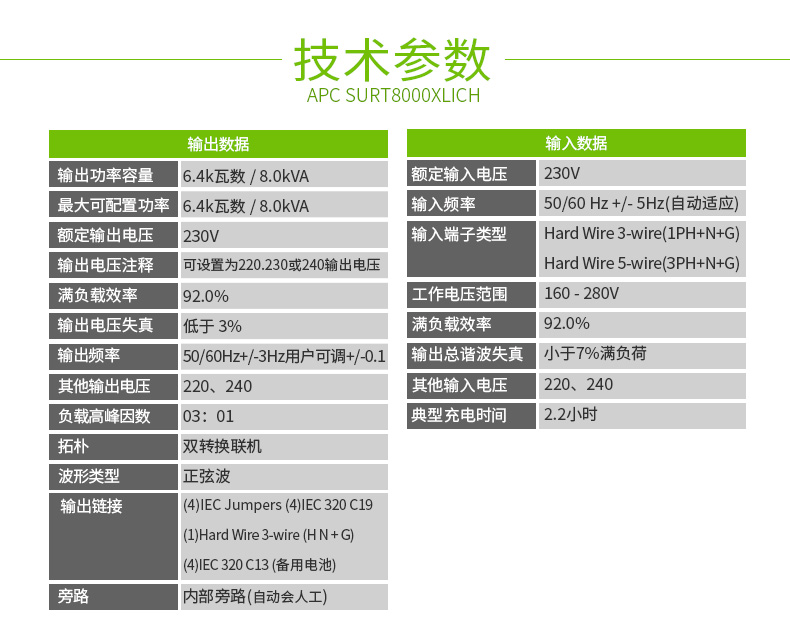 | 输出连接 | IEC 320 C13 (备用电池)IEC Jumpers (备用电池)IEC 320 C19 (备用电池)Hard Wire 3-wire (H N + G) (备用电池) |