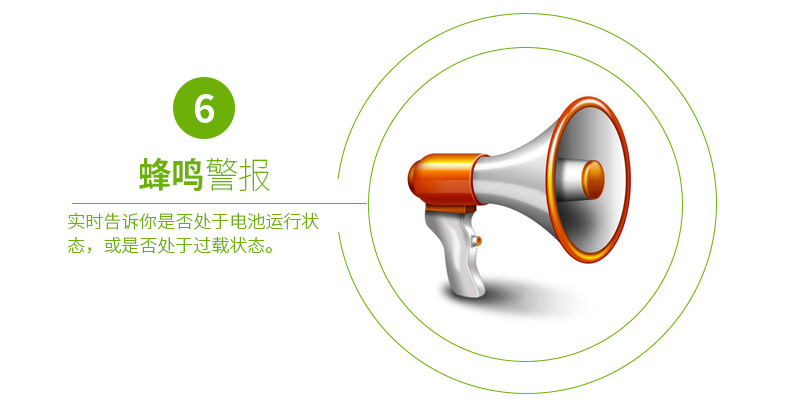 有声报警:实时告诉你系统是否处于电池运行状态,电池电压是否低,或是否处于过载状态。