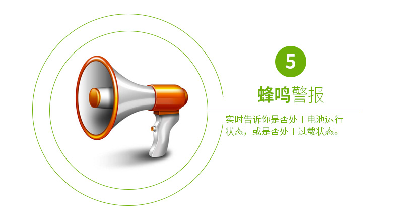 有声报警:实时告诉你系统是否处于电池运行状态,电池电压是否低,或是否处于过载状态。