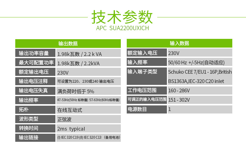| 输出连接 | IEC Jumpers(备用电池) IEC 320 C13(备用电池)IEC 320 C19 (备用电池) |