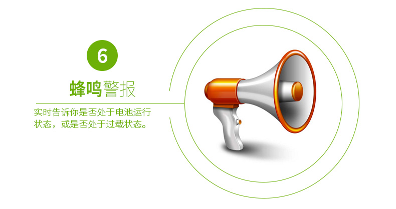 有声报警:实时告诉你系统是否处于电池运行状态,电池电压是否低,或是否处于过载状态。