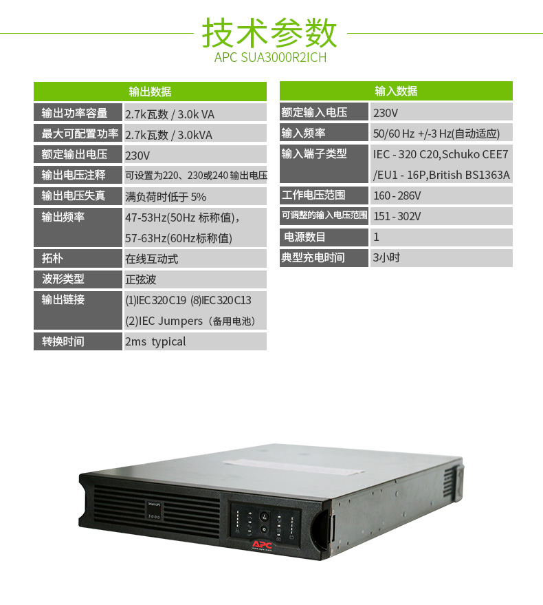 APC SUA3000R2ICH不间断UPS电源适用于UPS办公及家庭计算机电源保护。