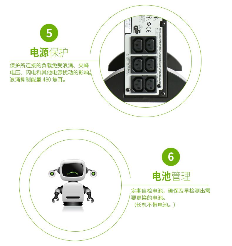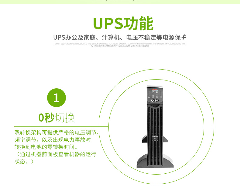 持续保护设备和数据:网络级电源调节功能可防止浪涌的危害和破坏性的噪音。双转换架构可提供严格的电压调节、频率调节、以及出现电力事故时转换到电池的零转换时间。