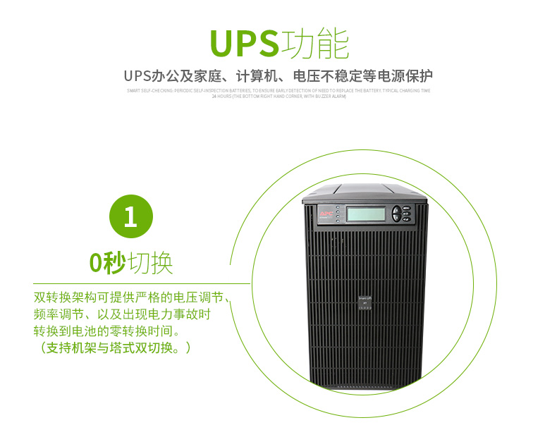 持续保护设备和数据:网络级电源调节功能可防止浪涌的危害和破坏性的噪音。双转换架构可提供严格的电压调节、频率调节、以及出现电力事故时转换到电池的零转换时间。