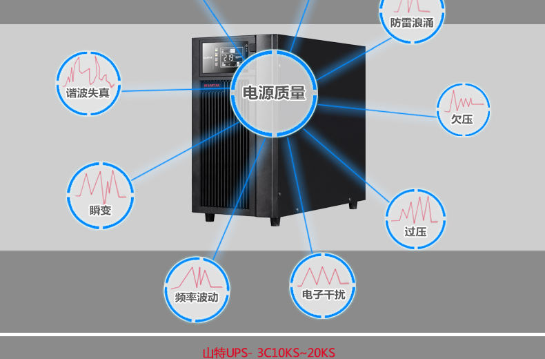 山特3C10KS系列UPS---传承上一代产品的优良品质,采用双转换纯在线式架构,外形美观,产品性能和产品可靠性大大提升。 对电网出现的断电、市电电压过高或过低、电压瞬间跌落或减幅震荡、 高压脉冲、电压波动、浪涌电压、谐波失真、杂波干扰、频率波动等状 况提供理想的解决方案,为用户负载提供安全可靠的电源保障。山特3C10KS是一款具有强大适应性、配置灵活的产品,采用先进的DSP数字控制技术,提供了非常丰富的可扩展功能, 用户可以根据需要灵活配置。