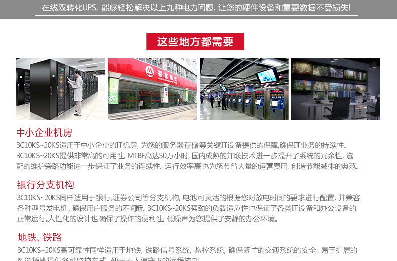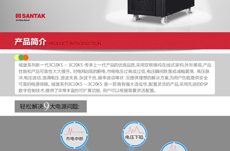 山特3C20KS系列UPS---传承上一代产品的优良品质,采用双转换纯在线式架构,外形美观,产品性能和产品可靠性大大提升。 对电网出现的断电、市电电压过高或过低、电压瞬间跌落或减幅震荡、 高压脉冲、电压波动、浪涌电压、谐波失真、杂波干扰、频率波动等状 况提供理想的解决方案,为用户负载提供安全可靠的电源保障。山特3C20KS是一款具有强大适应性、配置灵活的产品,采用先进的DSP数字控制技术,提供了非常丰富的可扩展功能, 用户可以根据需要灵活配置。