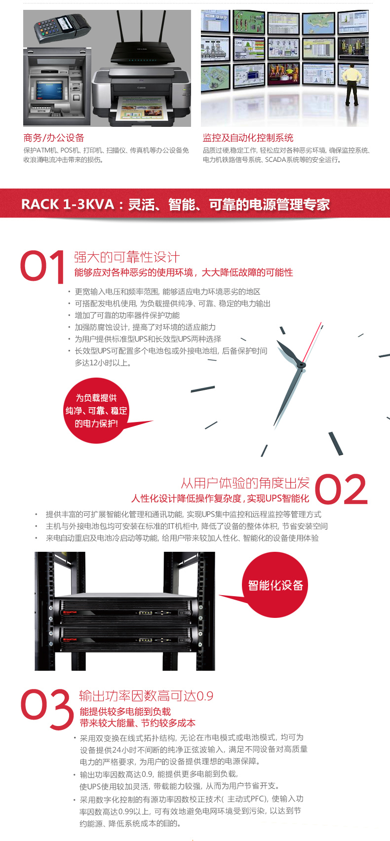 Rack UPS具备输入功因修正功能,在满载情况下,输入功因可以达到0.95以上,使用户的电网环境不会受到污染。