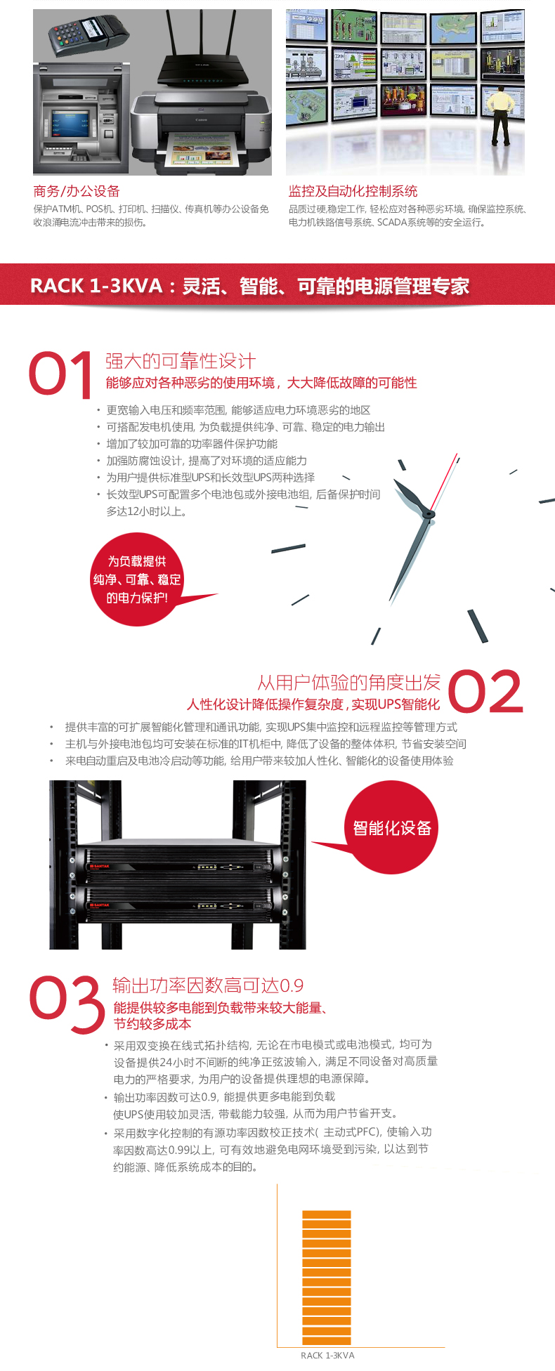 Rack UPS具备输入功因修正功能,在满载情况下,输入功因可以达到0.95以上,使用户的电网环境不会受到污染。