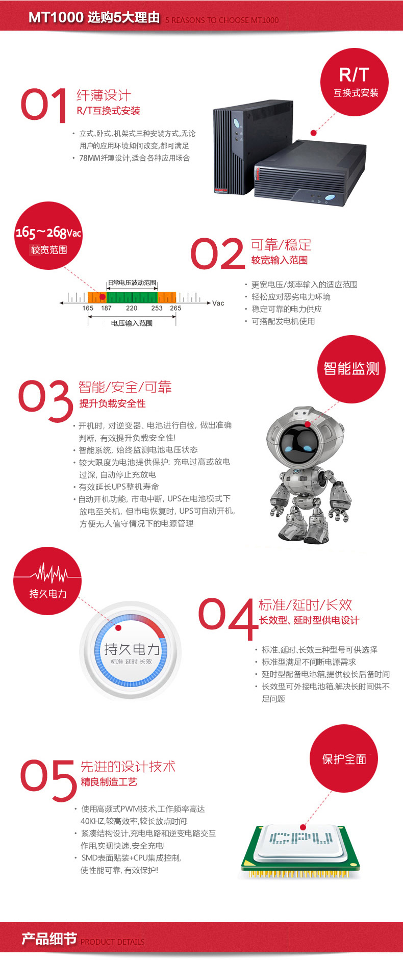MT- pro系列是智能上网型UPS,可提供各种通讯连接方式的电源管理方案。采用先进的CPU集成控制技术,并拥有超宽电压输入范围和独特的立式、卧式、机架 式三种安装方式;还特别配置稳压输出电源插座、浪涌保护插座和智能插卡,是中小企业、政府及教育等行业的服务器、网络设备及工控产品的理想保护电源。