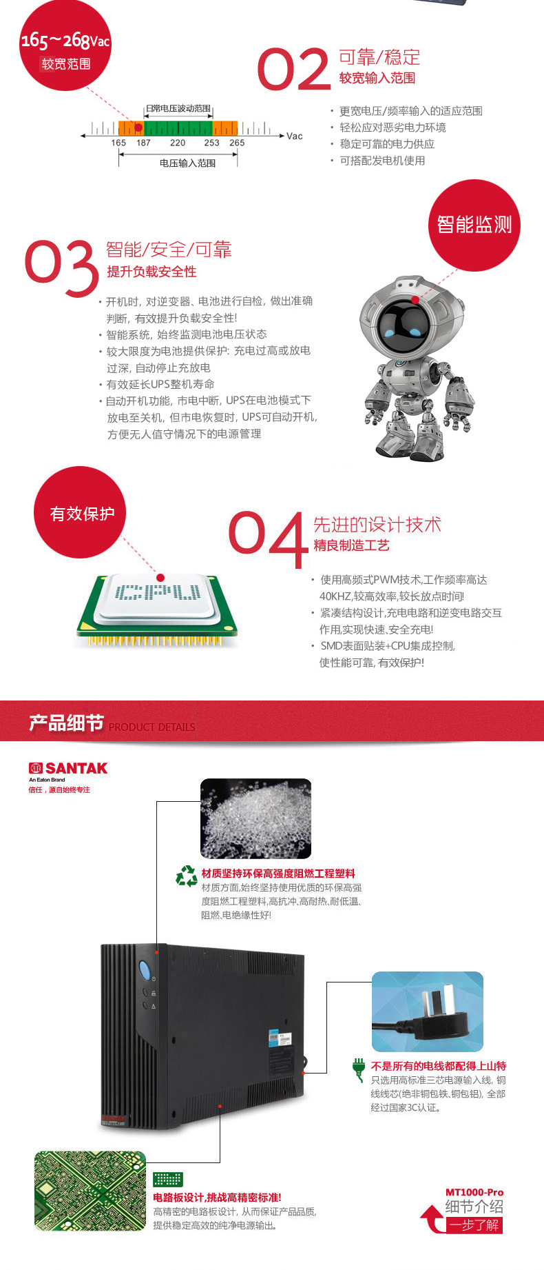 MT- MT1000-s系列是智能上网型UPS,可提供各种通讯连接方式的电源管理方案。采用先进的CPU集成控制技术,并拥有超宽电压输入范围和独特的立式、卧式、机架 式三种安装方式;还特别配置稳压输出电源插座、浪涌保护插座和智能插卡,是中小企业、政府及教育等行业的服务器、网络设备及工控产品的理想保护电源。
