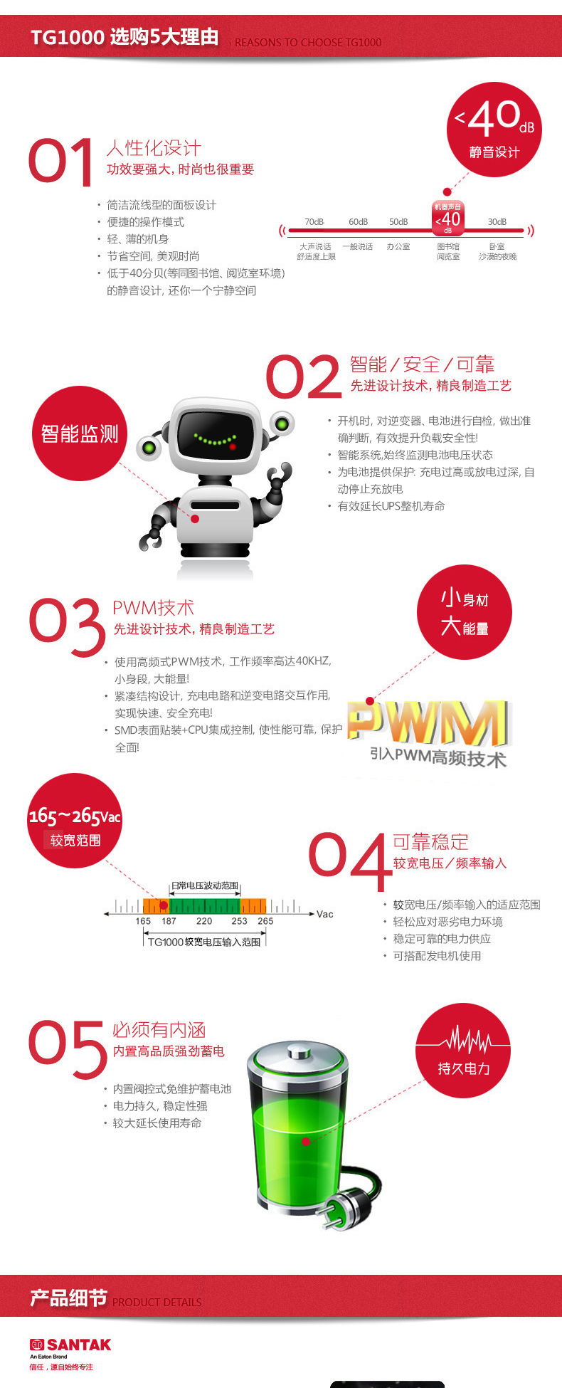 先进的SMD表面贴装技术和 CPU集成控制技术的应用,使TwinGuard(TG)系列UPS 的性能更可靠。能对各类电力问题 ( 断电、短路 、过载 、高低压、突波) 做出精确、可靠地处理,为负载提供全方位的保护。