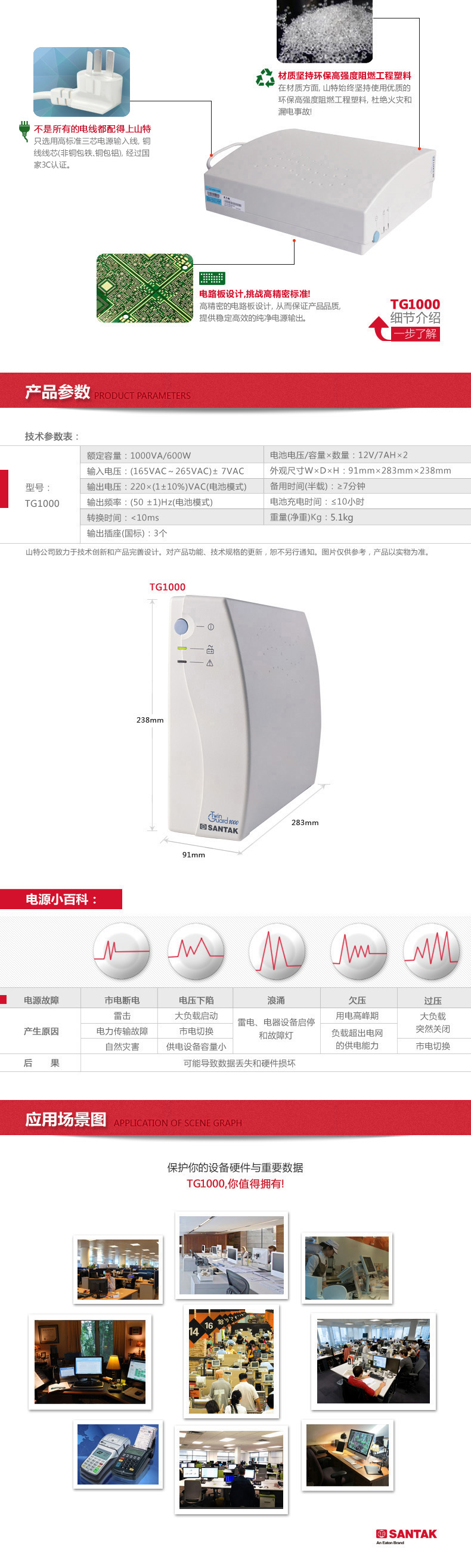 山特TG1000 TwinGuard(TG)系列UPS适用于PC机及其外围设备(打印机、扫描仪、路由器 、Modem ),稳定性高,可靠性强。轻松走入家庭和办公环境 ,帮您节省有效空间。对于PC用户而言,计算机周围拥挤不堪的状况变得轻松、和谐。面板简洁明快、容易操作。