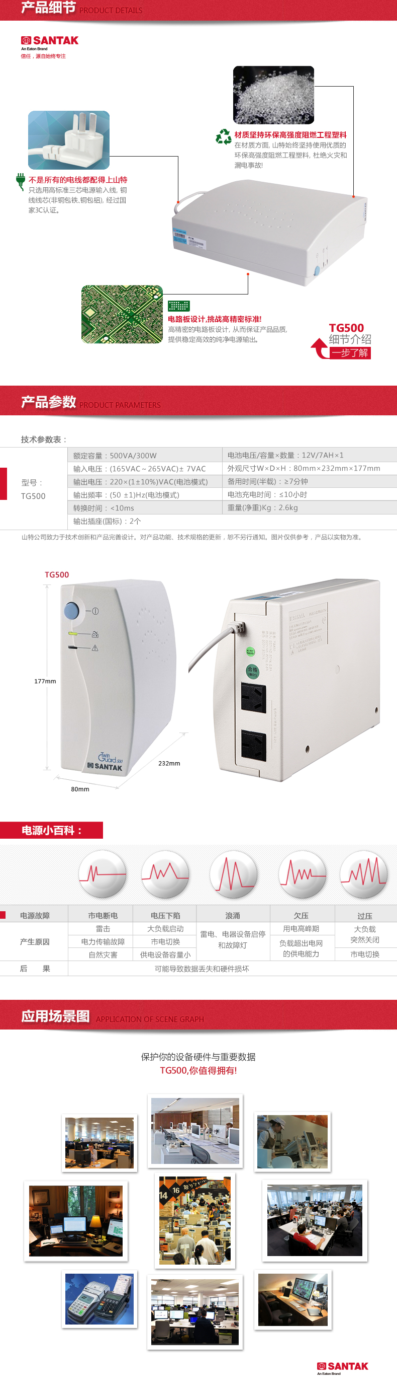 山特TG500 TwinGuard(TG)系列UPS适用于 PC机及其外围设备 ( 打印机、扫描仪、路由器 、Modem ),稳定性高,可靠性强。轻松走入家庭和办公环境 ,帮您节省有效空间。对于PC用户而言,计算机周围拥挤不堪的状况变得轻松、和谐。面板简洁明快、容易操作。