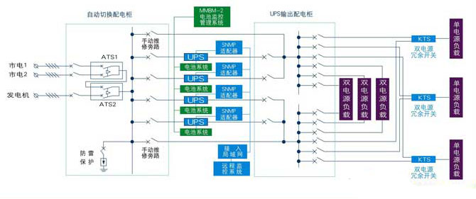 【项目内容】:基于对上海邮政储蓄银行用户需求背景的综合分析,针对金融系统大型数据中心和关键设备的网络系统特点,驰庆机电提出了以保证用户负载的可靠供电为设计前提,同时具备高效节能特点的机房解决方案。此设计的此方案主机采用2套KELONG牌120KVA功率FR-UK系列UPS,构成1+1冗余并机方案。优势有: