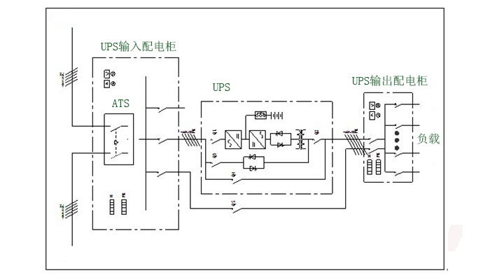 单机系统的组成由UPS主机、后备电池组+电池直流断路器、相关的输入、输出配电系统,检修维护配电,应急市电配电等。